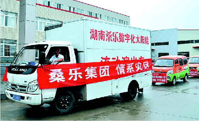 一辆辆满载桑乐爱心的救灾车冒雨翻山越岭,首站到达岳阳县重灾区相思乡,将第一批5万元救灾物资送到给灾民手中。桑乐员工冒雨运送赈灾物资,让相思乡党委书记陈君辉深受感动,他说:“你们不顾沿途泥石流的危险,将温暖送到受灾群众手中,极大地鼓舞了我们。不论有多困难,我们将全力以赴抗灾,尽早重建家园”。