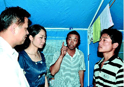 桑乐公司将满满的几车救灾物资交到灾民安置点后,随相关负责人一同进入集中安置点进行慰问。耿刚等人看到一座座蓝色的灾民帐篷,灾民围坐帐篷边,心情十分沉重。当他们走到15岁的毛罗健床前,看着眼前的4张遗像,想到这个孩子一夜之间就失去了父母、爷爷奶奶,内心都十分难受,一边将数箱救灾物资送到他手边,一边抚摸着他的手鼓励他勇敢面对今后的学习生活。
