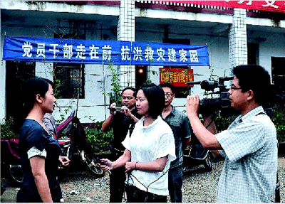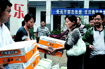 下午4点50分,赈灾车队又马不停蹄驱车赶往灾情较为严重的临湘詹桥贺畈乡。下午6点20分,赈灾车队才到达贺畈中心小学。一下车,工作人员忙将救灾物资送到灾民集中安置点。