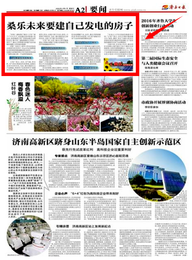在光伏领域,桑乐已拥有十余年技术积累,并在全国推广超百兆的分布式光伏电站。目前又计划引进美国第三代有机电池薄膜产品, 与国内第二代光伏产品相比,对环境无毒无害,推广价值巨大。此外,桑乐凭借掌握的四十多项专利成果,为打造“绿能全空间”生态环境,提供整体的支持。山东省减灾中心泉城公园项目被称为山东省第一批超低能耗示范建筑,就是综合运用了太阳能空调、空气源热泵 、光伏电池、太阳能集热器等新能源最新技术,也就是济南人口中的“被动房”。