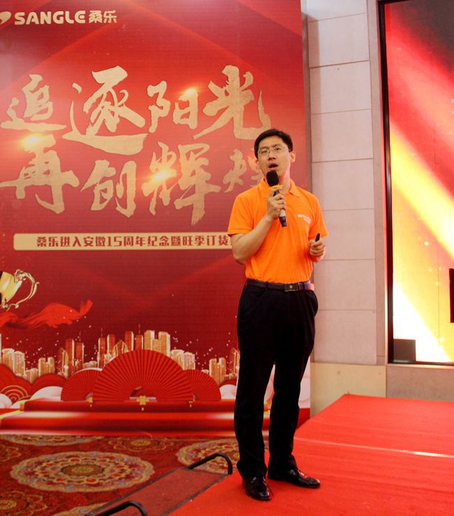 集团王雪广董事长莅临会议现场并发表主旨演讲,首先,他代表桑乐集团对安徽经销商的到来表示热烈的欢迎,值此桑乐太阳能进入安徽市场15周年之际,感谢桑乐家人对公司的信任和支持。董事长从自身经商经历讲起,讲到做任何事情都要坚定信心,执着,忠诚自己的事业,以平稳的心态发展自己的事业。桑乐30年的发展,证明桑乐是具有品牌和内涵的企业。在经济发展日新月异的今天,产业布局竞争激烈,桑乐的优势在于技术优势,打造桑乐“环保、节能、绿色”的产业布局,做好终端市场。2018年是桑乐入驻安徽15周年,安徽充分发挥乡镇市场的区域优势,市场厚积薄发,业绩突出,希望今后的日子里,公司和经销商共同成长,共同发展。安徽工程市场近年来也有重要突破,尤其是在平板工程领域满足了高端用户的市场需求,公司将会从技术、价格、服务等多个角度进行扶持。