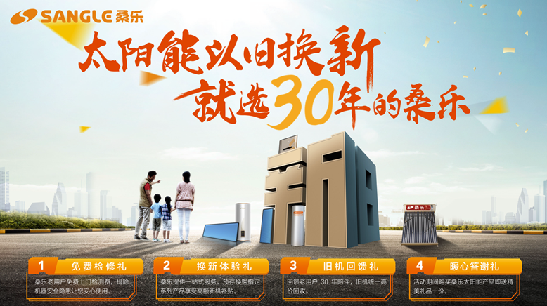 我们给大家提供了太阳能以旧换新的4大实惠。第一,免费上门检修,无论是否是桑乐品牌,都可以联系桑乐授权网点,为家里的太阳能做体检,保障使用安全。第二,换新太阳能,享受新机换购补贴,新产品优惠300-1000元不等。第三,旧太阳能统一现金回收。第四,购买指定型号产品可以领取以旧换新礼品一份。