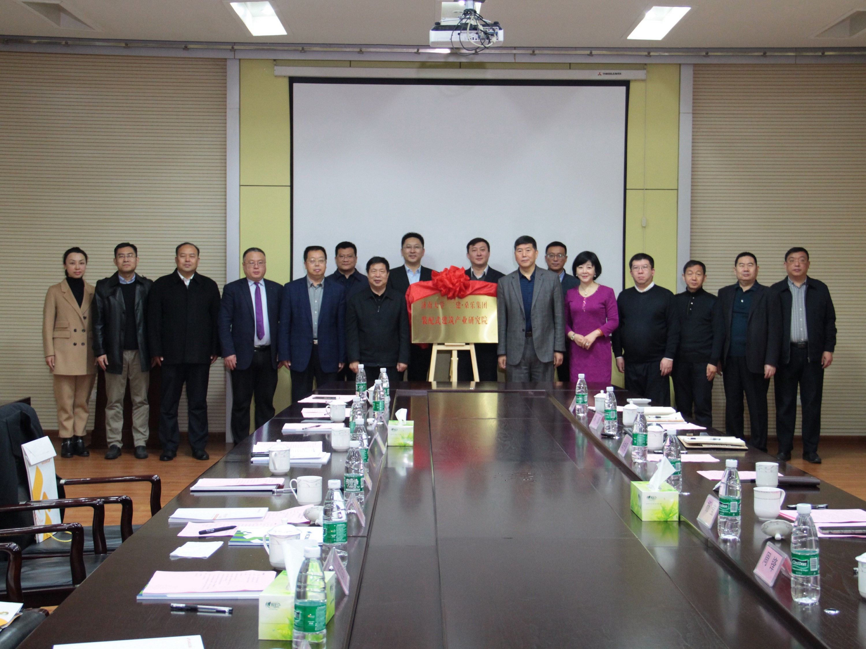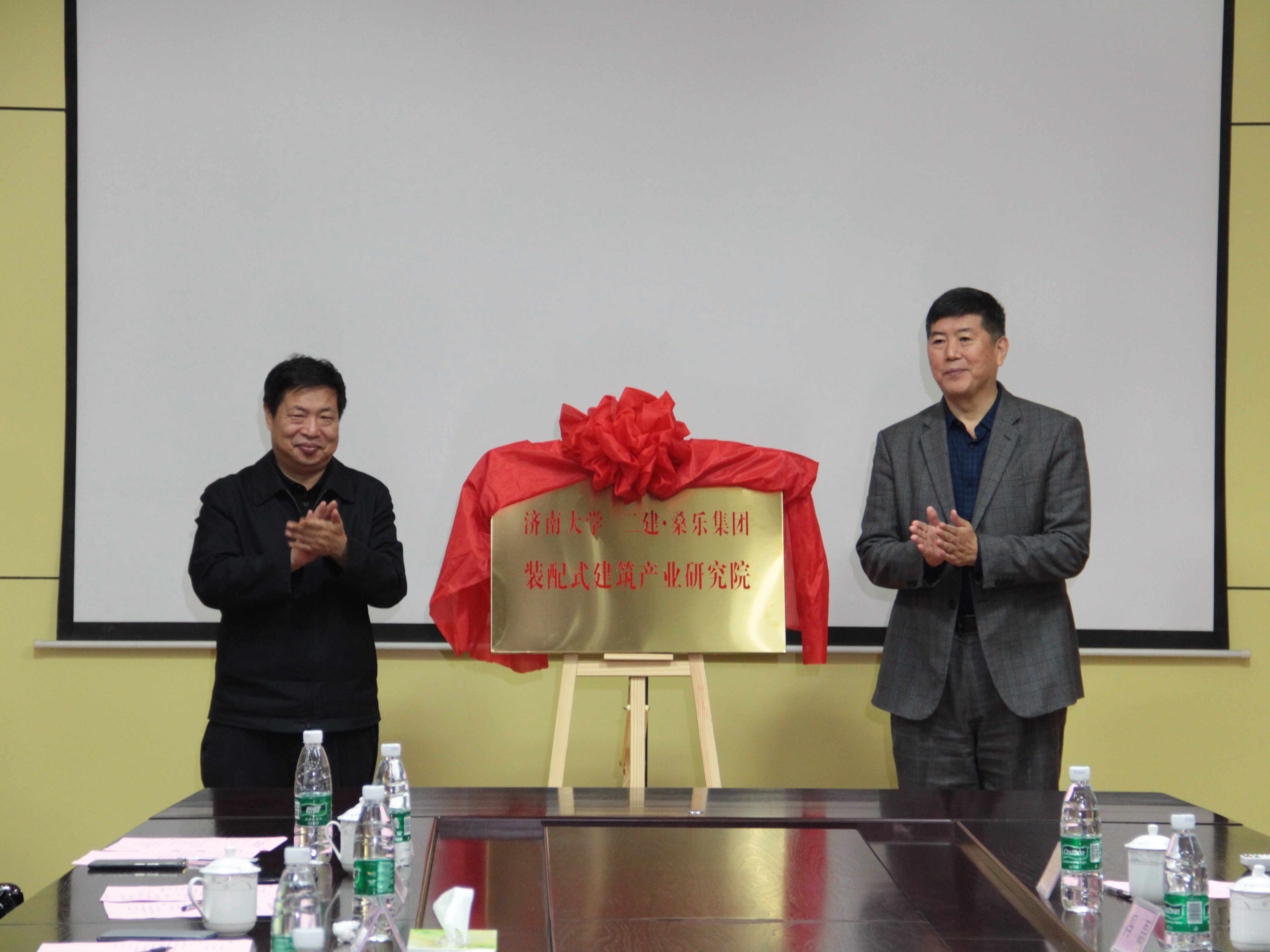 济南大学党委书记徐景颜与集团董事长王雪广共同为济南大学、二建.桑乐集团装配式建筑产业研究院揭牌