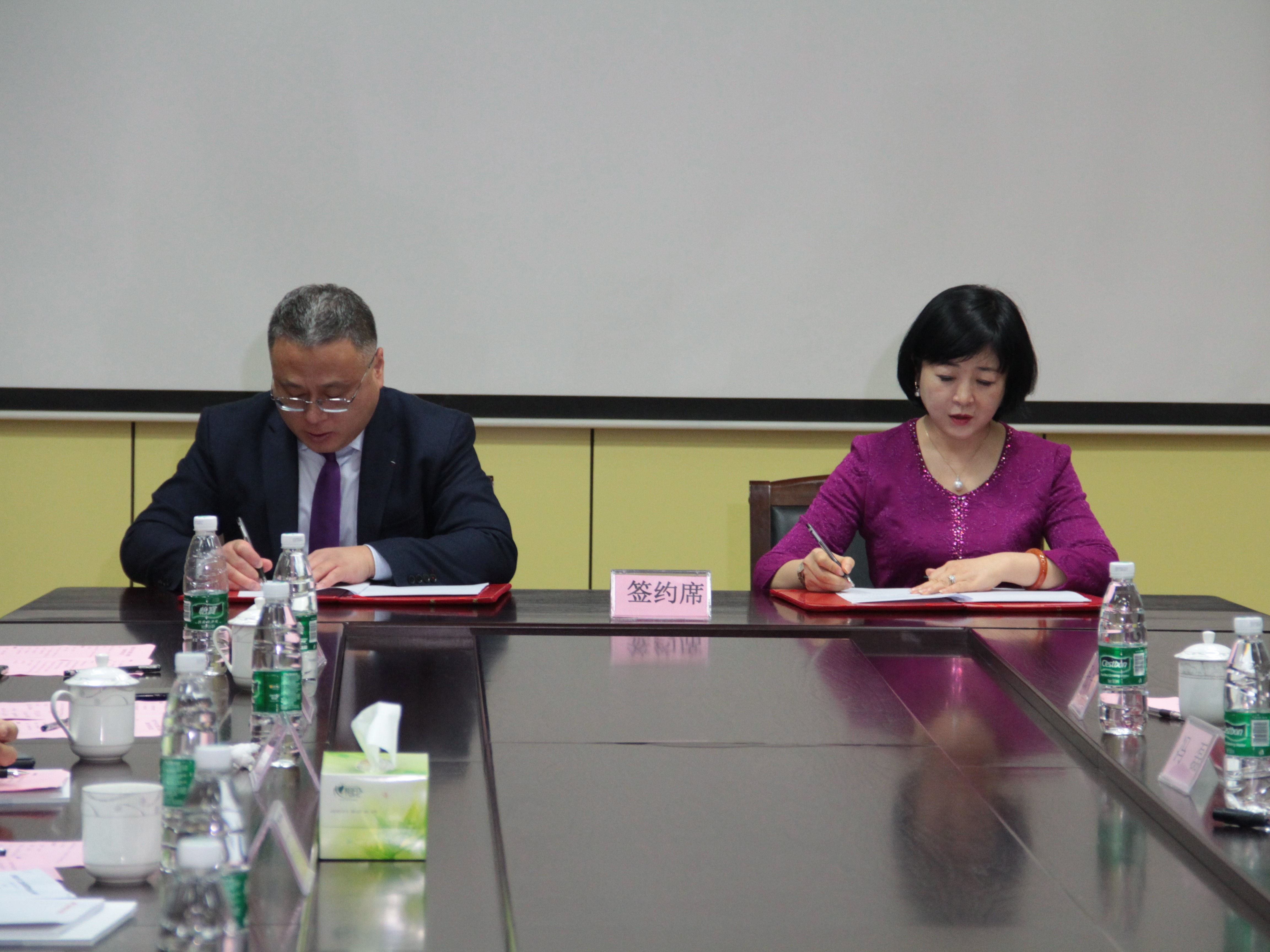 济南大学科技处处长、科技成果转化办公室主任黄加栋与二建集团党委书记、副董事长、桑乐集团董事杨莹签订校企战略合作协议