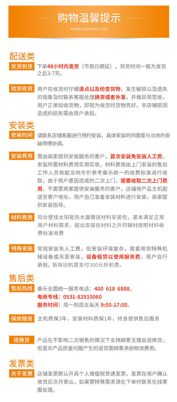凡在桑乐商城购买的产品,包括:太阳能热水器,净水设备,空气净化器,都可享受我们为您提供的保修服务。